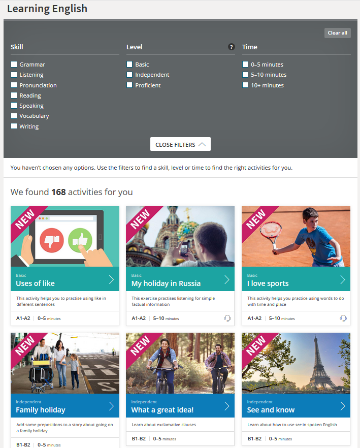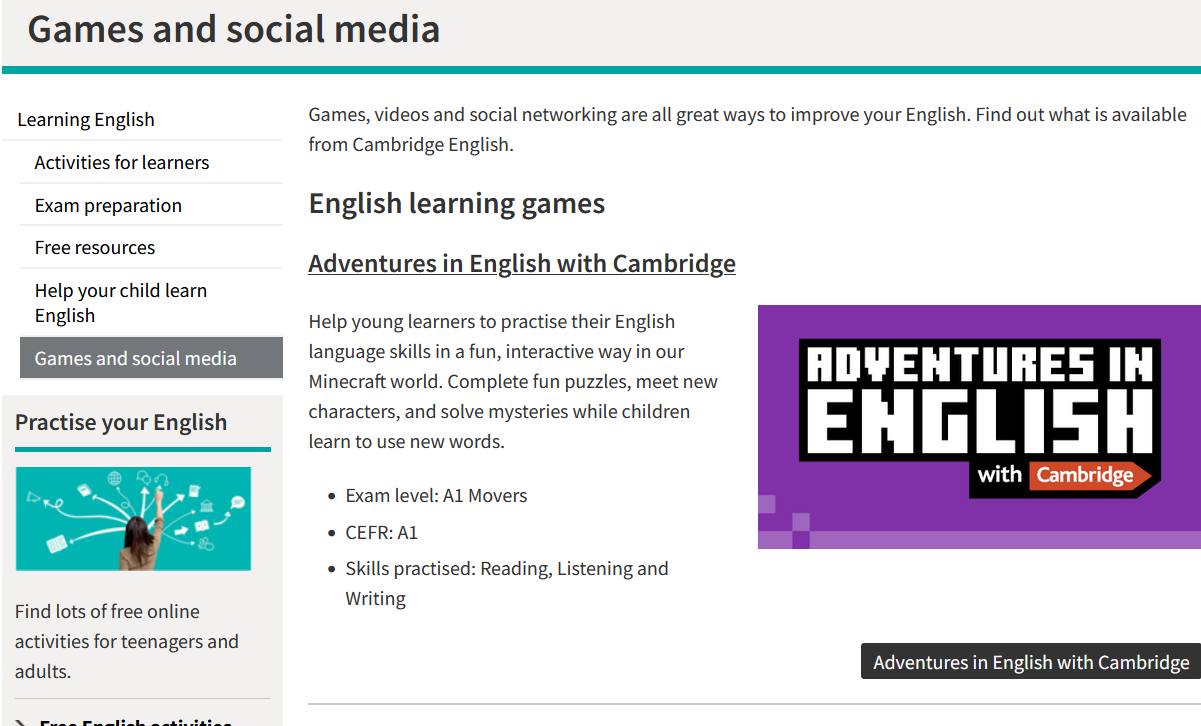 This page allows you to access all of Cambridge's learning materials. Choose the level and skill you would like to practice.