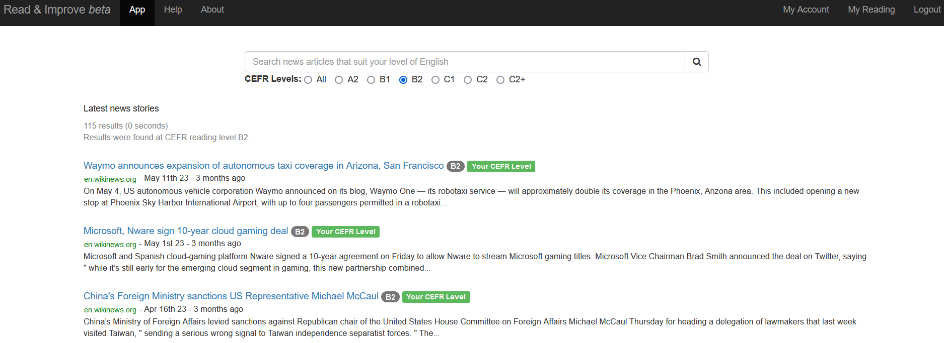 This tool provides up-to-date news articles from around the world, graded according to the level of the language they use on the internationally-recognised CEFR Scale. All you need to do is choose your level. It also shows you the meaning of words you don't know, and you can write a summary of the text and receive 2 different scores: one for your writing and one for if you covered the important topics. It will keep a record of your progress.